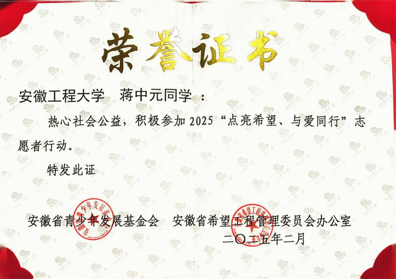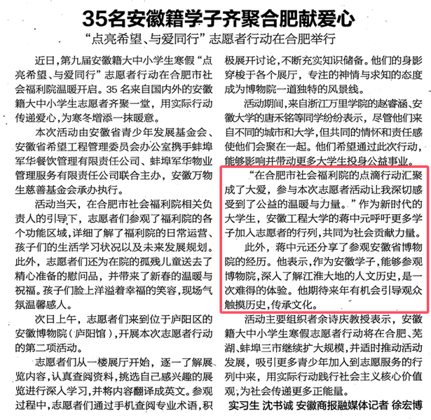 此次志愿者行动由安徽省青少年发展基金会、安徽省希望工程管理委员会办公室等多家单位联合主办,蒋中元与来自国内外的35名安徽籍学子齐聚合肥,共同参与了一系列公益活动。他前往合肥市社会福利院,为孤残儿童送去慰问品和新春祝福,并深入了解福利院的运营与孩子们的生活状况;积极参与安徽博物院展览内容的翻译与学习,通过查阅资料和团队讨论,深入了解江淮大地的人文历史。蒋中元的优异表现不仅赢得了活动组织方的高度评价,也感染了身边的同学。他在接受采访时呼吁更多学子加入志愿服务的行列,共同践行社会主义核心价值观,传递社会正能量。