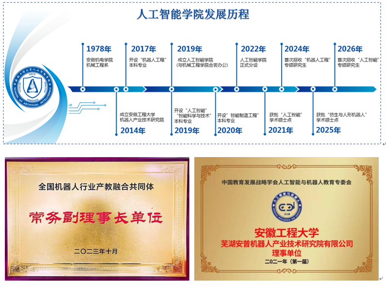 999策略手机论坛版的办学历史可追溯至1978年安徽机电学院机械工程系,2019年8月正式成立999策略手机论坛版。学院现有机器人工程、智能科学与技术、人工智能、智能制造工程4个本科专业。拥有“机器人工程”和“智能制造技术”两个专业硕士授权点和“人工智能”和“仿生与人形机器人”两个交叉学科学术硕士学位授权点。学院下设机器人工程系、智能科学与工程系、人工智能系、实验中心、大学生创新创业训练中心等机构。学院为安徽省人工智能学会副理事长单位、安徽省机器人产业技术创新战略联盟发起单位。