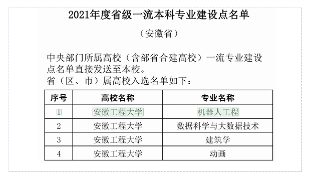 机器人工程专业于2021年入选安徽省一流本科专业建设点。按照“中国教育在线”的专业排名,我院的人工智能专业和机器人工程专业均获评B+等级。2020年创办的“人工智能微专业”在起到了较好的示范效应,依托学院实验室资源承办的安徽省大学生工业机器人大赛收到了广泛好评。学院荣获全国高校人工智能教育教学“先进单位”,1项成果入选全国高校机器人产教融合典型案例,2022、2023年两次入选恰佩克奖中国高校产教融合50强。